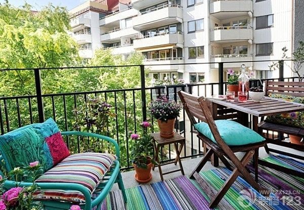 別忘了,你還可以利用顏色和圖案豐富你的陽臺,下面這個特色空間,一個藍(lán)綠色的坐墊、一身條紋的長椅以及豐富多彩的地毯。