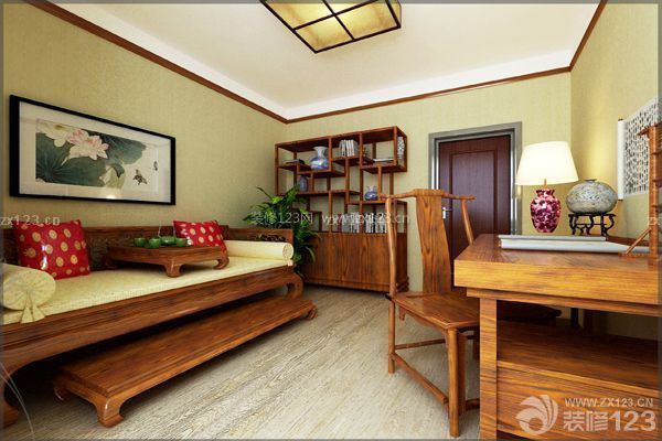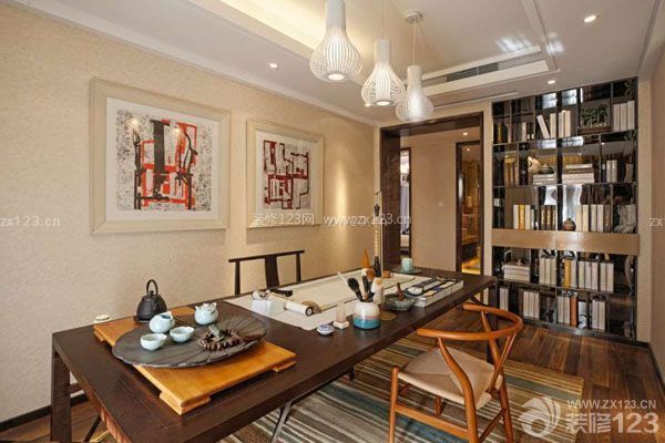 大型的書(shū)架收納了整面墻壁的書(shū),還設(shè)置了屏風(fēng)樣式的隔斷,是一個(gè)很好的家居裝飾,凸顯古色古香的優(yōu)雅特點(diǎn)。