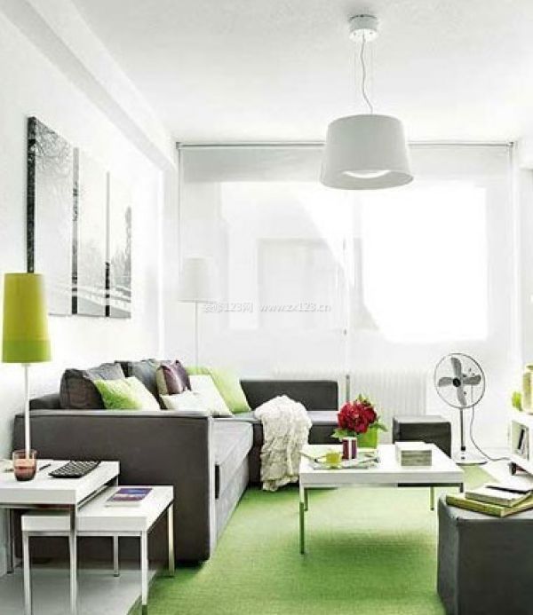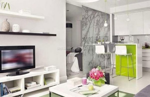 在這間40平的小戶型裝修案例中,綠色的運用起到了極大的作用。客廳中無處不在的綠色元素簡搭白色墻面,讓客廳舒適明亮又輕快,也是擴大小戶型客廳視線的最好方法。配套的四角形茶幾和小柜子,讓客廳空間穿插著利落分明的通透感,沒有太多修飾反而更令人耳目一新。