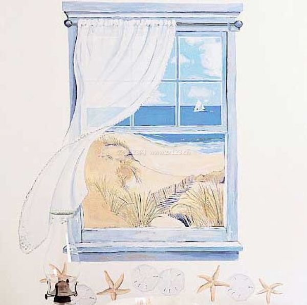 想要一扇能看到美麗風(fēng)景的窗戶嗎?你看,藍(lán)色的天、藍(lán)色的海還有美麗的白云和帆船,在飄逸的窗簾下吹來了一陣清爽的風(fēng)。這樣一款自然又逼真的壁飾,能給家增添無窮的魅力。