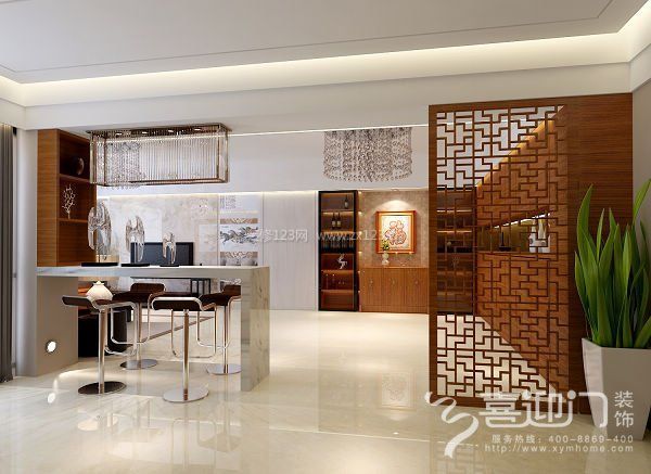 1、先做功能布局調(diào)整:原入戶花園與客廳的墻體拆掉,改為吧臺(tái)和鞋柜、收納柜,增加客廳的空間感和利用率。同時(shí)增加天花造型,使吧臺(tái)位置顯得更加整體時(shí)尚。