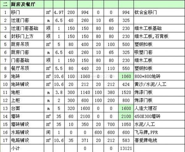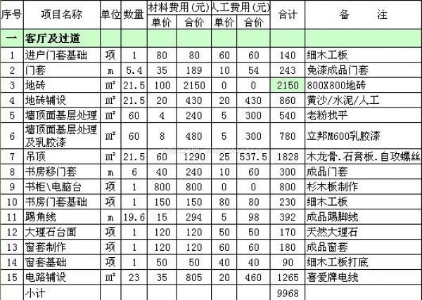 裝修之前的裝修預(yù)算表,各位業(yè)主一定要認(rèn)真去做好,同時要貨比三家,選性價比最高的裝修公司來做。對于家裝費用的控制,關(guān)鍵還是材料費用的控制。大家不妨了解一下具體的人工及材料價格,這樣心里有數(shù),就不會中裝修公司的價格陷阱了。