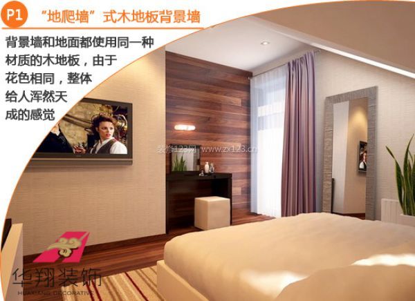 在裝修中,比較常見的是“地爬墻磚”,即地面用的瓷磚與墻面用的瓷磚一致。而地爬墻木地板也是如此,背景墻的用材與地面相同,且一般都連接起來,由于材質(zhì)統(tǒng)一、花色相同或相近,整體給人一種渾然天成的感覺,裝修效果非常具有藝術(shù)性。