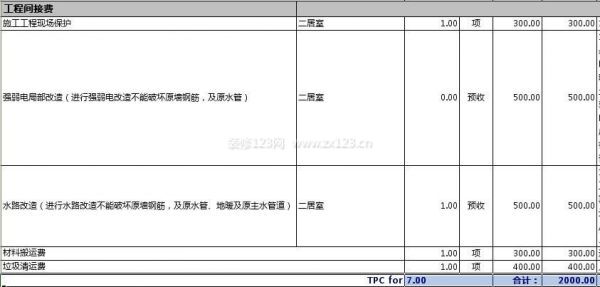 施工保護費,垃圾清運費,材料運輸費,除過這三項最好不要有其他費用,比如有的公司什么磨損費,巧立名目多得很。所有工程費用總和是32823元,其中還有一千的水電預(yù)收,再加上管理費10%,最后來中鐵的130平方半包為36106元。