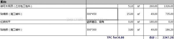 再看陽臺,墻磚地磚,吊頂,裝修公司負責(zé)貼磚,綠可木吊頂包工包料,業(yè)主買磚就行,看詳細預(yù)算