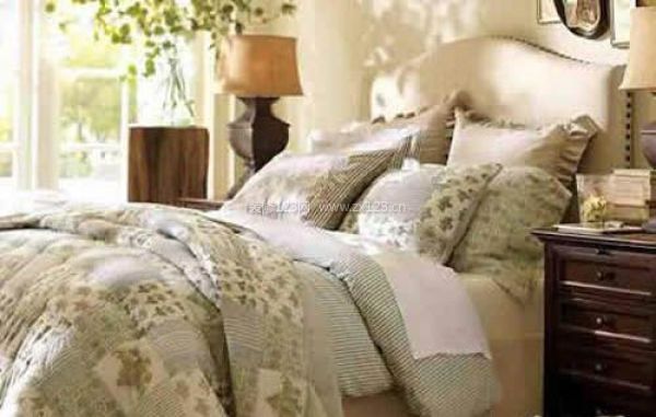 臥室這張大床從遠(yuǎn)處看來(lái),好像床頭是藤制的材料,其實(shí)床頭真正的材料是布藝,只是有藤制品的圖案。