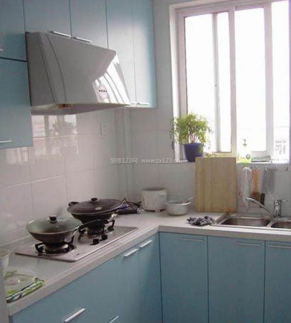 廚房的顏色跟客廳就不一樣,白色配淡藍(lán)色,同樣闡述著清涼,清晰家裝的感覺,L型櫥柜很漂亮。
