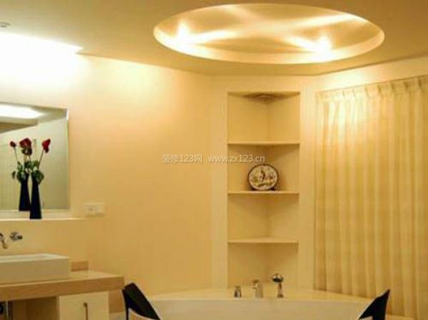 浴缸的上方,用一個與之呼應(yīng)的圓形造型作為吊頂?shù)闹饕O(shè)計符號。原本簡單的空間,在圓燈池里排列有序的燈光映照下,平添了幾分奢華與感性。