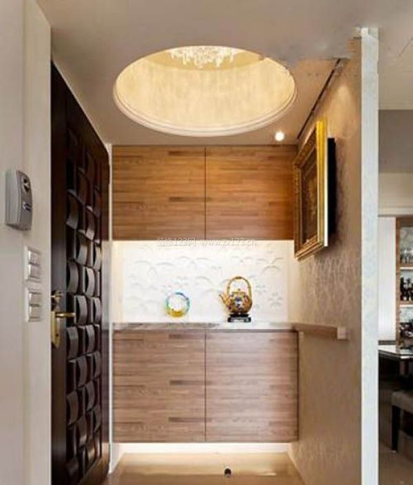這個設(shè)計是適合家里有比較多的吊頂設(shè)計,看得出來這個圓形造型做得比較深,如果客廳處有對應(yīng)相似的吊頂?shù)脑?,整體看起來會很有層次感,圓形造型的燈光襯托,會讓整個玄關(guān)顯得高很多。