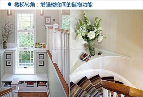 設計技巧:樓梯轉角設計往往會被大家作為重點裝飾區(qū),像這種設計成榻榻米的書臺,也就相當于增加了一個小書房。螺旋造型的樓梯間與墻角額外設計的墻角擱架,讓樓梯小角落驚艷無比,弧形的人性設計,讓行走時不會被碰到,不僅可以擺上插花作為樓梯間的裝飾,還能放上幾本小書讓腳步留住。