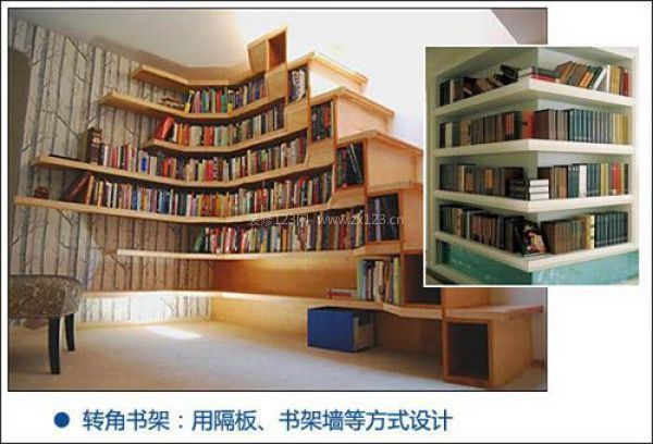 設計技巧:像這種轉角墻面設計很有新穎,通過支架隔板的方式改造成帶有儲物空間的墻面,帶有很好的收納空間。用書架做了轉角延伸,讓角落的每一個細節(jié)都趨于完美。講求空間的實用性,同時也更注重其美感。