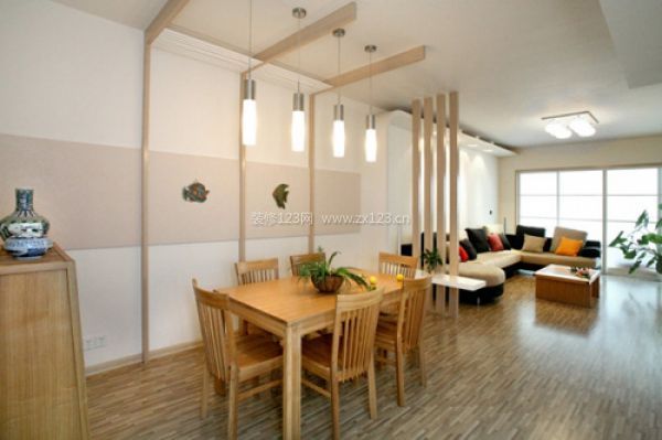 淺色木紋的修飾讓空間有著和諧之美?;⌒螇γ嬖煨团渖匣野椎貌妓嚿嘲l(fā),在客廳空間成為一道風(fēng)景線。 木格柵造型將客廳和餐廳分隔出兩個區(qū)域,既融合又可以相對獨立。簡潔但不顯簡單電視墻。一縷陽光灑進來,讓人流連忘返。墻紙在客廳電視墻上的運用為整個空間增色不少。休閑的客廳配上休閑的沙發(fā)和家具一切都顯得那么悠然自在。