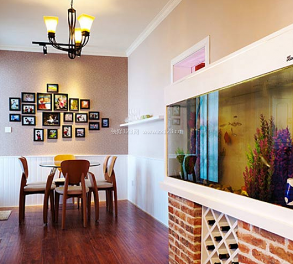 照片堆砌成為餐廳裝修設計的背景墻,不但大方好看,還在小小墻面展現(xiàn)家庭生活的點點樂趣。內嵌式的浴缸和紅酒架為空間增加了許多情趣。