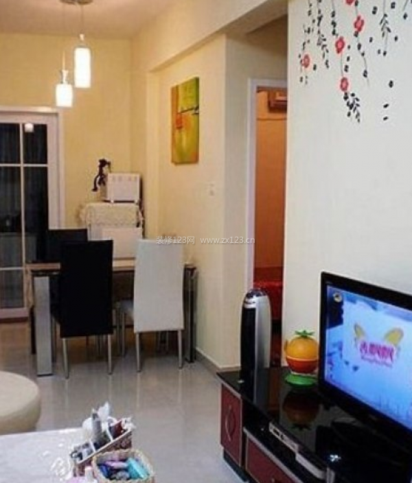 這個(gè)角度可以看見(jiàn)電視背景墻上方的手繪小花,燃空間顯得十分生動(dòng)有活波。餐廳上的吊燈是業(yè)主自己買(mǎi)的。而簡(jiǎn)易的餐桌能夠容納一家人,微小的餐桌不但能保證基本的功用,還拉近一家人的距離。