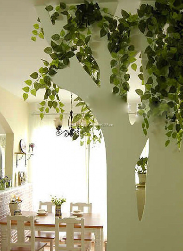 客廳餐廳一體裝修時(shí)候,木頭造型的隔斷墻,在上面掛上塑料了你也,讓家中綠意常在。