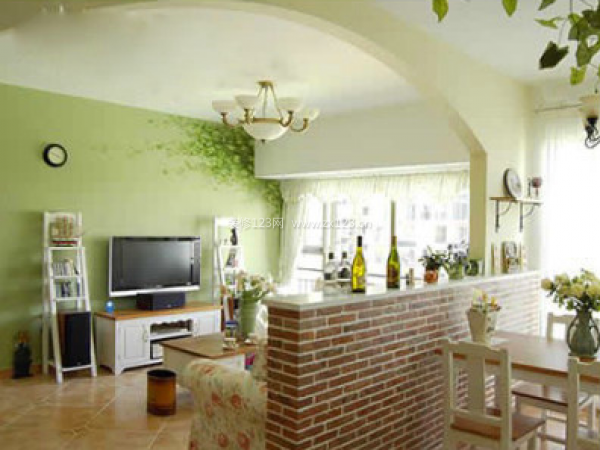 電視背景墻采用綠色粉刷。角落手繪長(zhǎng)春藤葉子,翠綠的顏色不但能放松人的眼球,還產(chǎn)生仿佛家居在田田藤葉之中。半人高的隔斷,開(kāi)放的空間產(chǎn)生空曠的視覺(jué)感。拱形的墻壁隔斷增加了客廳餐廳一體空間的連同視覺(jué)高點(diǎn)。