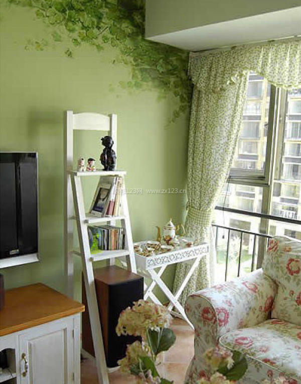 陽(yáng)臺(tái)的空間被縮減成為客廳餐廳一體的部分空間。落地窗戶的設(shè)計(jì)十分時(shí)尚自然?;ㄐ蛨D案和細(xì)碎的米黃色紗帳讓客廳餐廳一體空間擁有春天花園的享受。角落處的書(shū)架增加客廳餐廳一體空間的容納物品的能力,白色的外表,架子的造型如同春天的藤架。