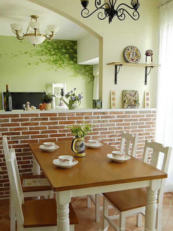 客廳餐廳一體空間的吊燈都采用富于線條變化的歐式吊燈。餐廳和客廳的間隔還能夠防止酒品和植物盆栽。仿造農(nóng)村后土切成的隔斷才充滿田園風(fēng)味。