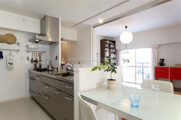 開放式廚房設(shè)計,餐廳和廚房同在一個分隔區(qū)間。金屬的材料有利于廚房清潔。綠色的植物盆栽有畫龍點睛的裝飾效果。