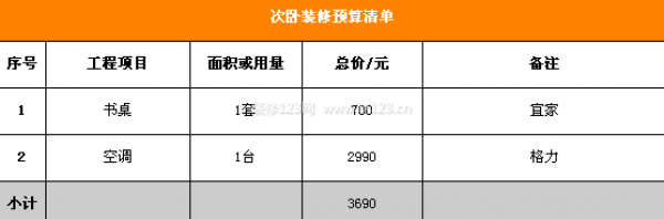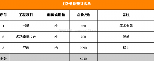 主臥的裝修預(yù)算清單(業(yè)主只列出相關(guān)家具所花費(fèi)的費(fèi)用)如下,