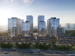鳳棲鷺鳴共規(guī)劃有2棟21F的高層,8棟13F、16F的小高層以及8棟2-3F的宋風(fēng)合院。10棟純板式高層分三排呈陣列式布局,中間一排沿場地東西兩邊布置,留出開闊的中庭空間。高層區(qū)南北向樓間距介于27-55米之間,東西向樓間距約120米,尺度適宜。8棟合院大體分兩排布置在場地南側(cè),合院2F為主,盡量減少對(duì)北側(cè)高層的視野阻隔。