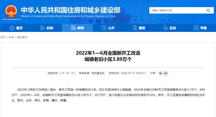 據(jù)統(tǒng)計,2022年全國計劃新開工改造城鎮(zhèn)老舊小區(qū)5.1萬個、840萬戶。2022年上半年,全國新開工改造城鎮(zhèn)老舊小區(qū)3.89萬個、657萬戶,按小區(qū)數(shù)計占年度目標任務的76.0%。其中,開工進展排名靠前的地區(qū)為河北、貴州、山東、湖北、安徽、重慶、新疆。