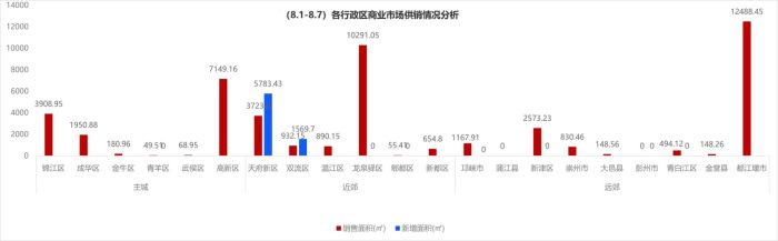 據(jù)有關(guān)數(shù)據(jù)顯示,8月1日-8月7日,成都商業(yè)市場錦江區(qū)等主城銷量大漲,天府新區(qū)等近郊供銷雙降,都江堰等遠(yuǎn)郊銷量穩(wěn)居上升。上周(8.1~8.7)亮點為都江堰區(qū)域銷售面積直線上線,成功“出圈”,具體如下: