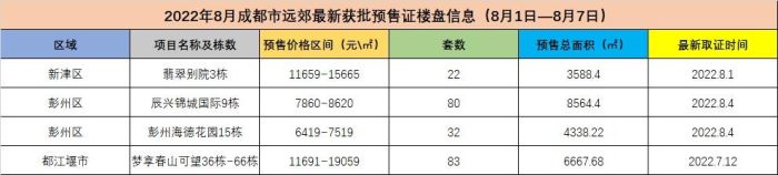 據(jù)數(shù)據(jù)統(tǒng)計(jì),2022年8月1日-7日,成都4個(gè)遠(yuǎn)郊樓盤新獲得預(yù)售證。這意味著樓市將迎來百花齊放,購房者在選擇時(shí)可真是“眼花繚亂”。那么,8月“上游”獲證樓盤有哪些看點(diǎn)呢?