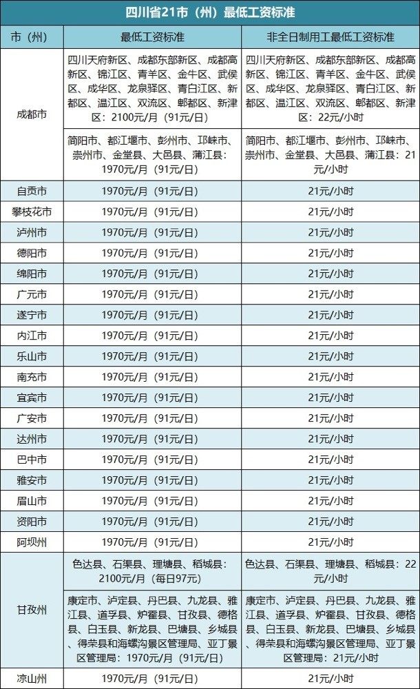 目前,四川省21市(州)最新最低工資標準全部公布,一起來看。