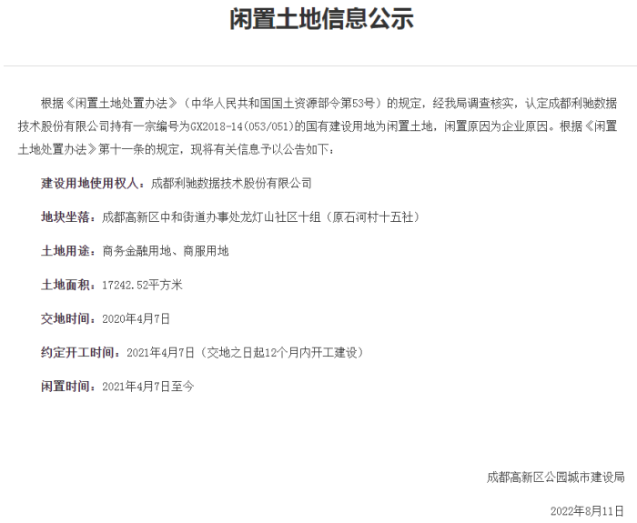 日前,成都高新區(qū)公園城市建設(shè)局發(fā)布一則閑置土地信息公示稱,認(rèn)定成都利馳數(shù)據(jù)技術(shù)股份有限公司持有一宗編號(hào)為GX2018-14(053/051)的國(guó)有建設(shè)用地為閑置土地,閑置原因?yàn)槠髽I(yè)原因。