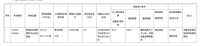 成都新津出讓1宗國(guó)有建設(shè)用地使用權(quán),宗地位置:花源街道牧馬山社區(qū)四組,編號(hào):XJ2022-07(0901) 商業(yè)用地 40年