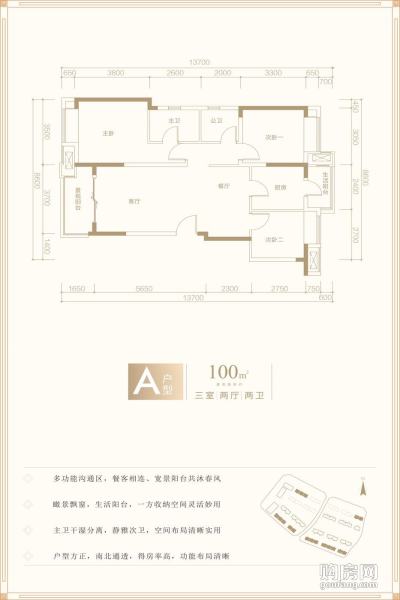 A戶型(3室2廳,100平,南北)