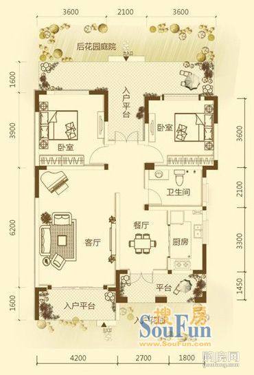 一期6號(hào)樓合院別墅R1戶型(2室2廳,88.32平,)