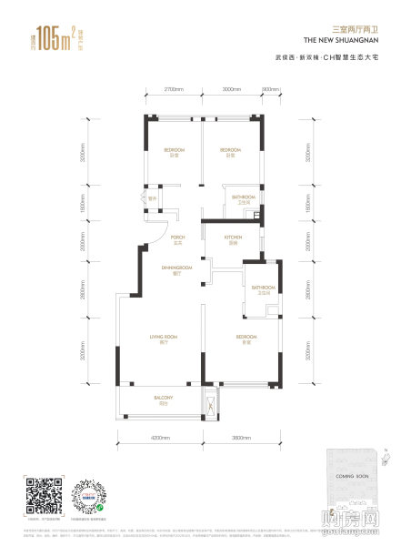 中國鐵建雙楠樾府-建面約105平戶型(3室2廳,105平,南北)