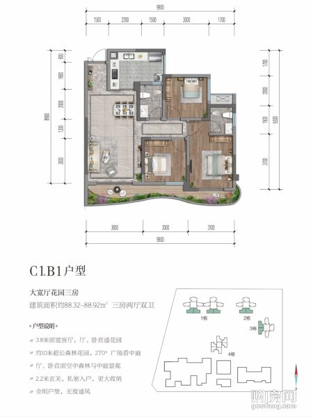 聯(lián)想天府云城C區(qū)C1B1戶型(3室2廳,88.32平,南)