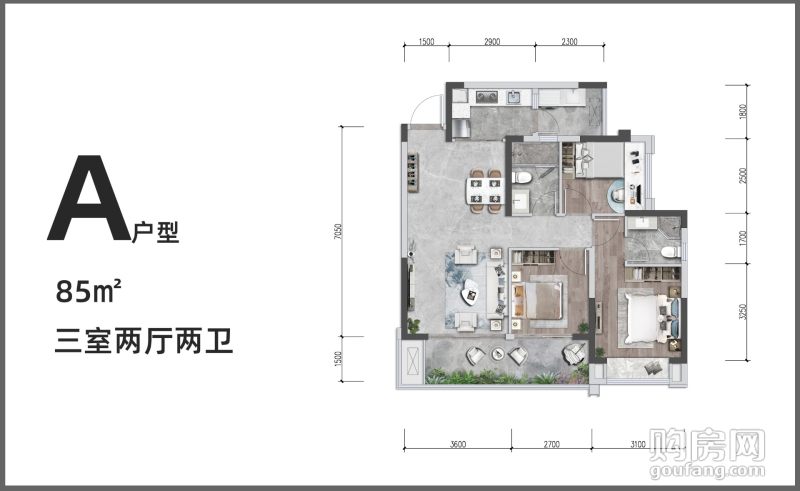 通威世地長(zhǎng)灣A戶型 (3室2廳,85平,南)