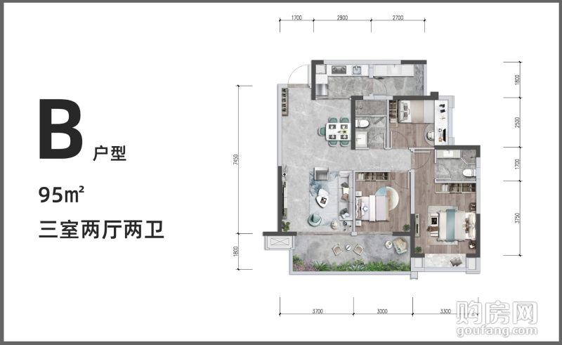 通威世地長(zhǎng)灣B戶型 (3室2廳,95平,南)