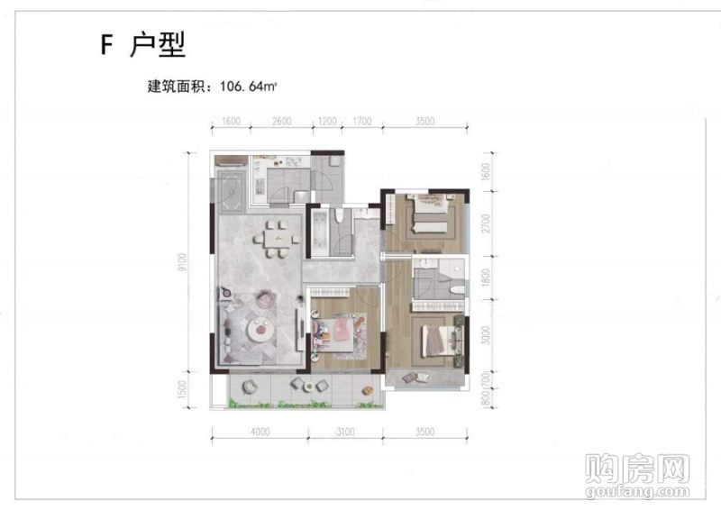 城投藝墅語(yǔ)湖F戶型(3室2廳,106.64平,南北)