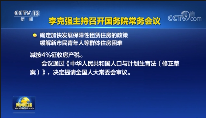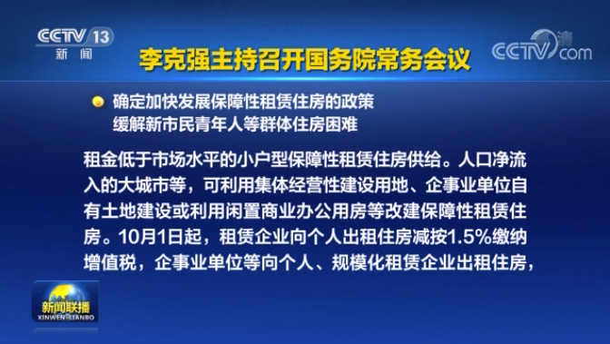 6月18日,國務院總理李克強主持召開國務院常務會議,決定從10月1日起,住房租賃企業(yè)向個人出租住房適用簡易計稅方法,按照5%征收率減按1.5%繳納增值稅;對企事業(yè)單位等向個人、專業(yè)化規(guī)?;》孔赓U企業(yè)出租住房,減按4%稅率征收房產(chǎn)稅。
