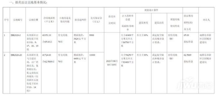 一號宗地編號:DB2020-3。宗地位置:東部新區(qū)石盤街道衛(wèi)星社區(qū)8、9、17、18、19組。凈用地面積:43353.33合65.03畝。土地用途及年限:住宅用地70年 。樓面起始價:3820元/平方米。計算容積率:大于43400平方米且不大于86700平方米。建筑密度:不大于30%。建筑高度:滿足航空限高及城市設計要求。拍賣時間:2021年8月3日。